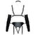 Ouvert-Set von Bad Kitty mit busenfreiem Riemen-BH, schrittoffenem Straps-Slip, Halsband und 2 Fessel-Armstulpen. Im schwarzen stilvollen Mattlook mit silberfarbenen Accessoires. Weich und elastisch für hohen Tragekomfort. BH-Träger passend verstellbar. Straps-Slip mit verstellbaren Strumpfhaltern, die auch komplett abnehmbar sind. Genauso wie die Karabinerkette im offenen Schritt. Schmales Halsband mit Ring vorne und verstellbarem Druckknopfverschluss im Nacken. Seitlich in die Ringe von BH und Slip können für softe Bondagespiele die beiliegenden Fessel-Armstulpen mit ihren Karabinerhaken befestigt werden.