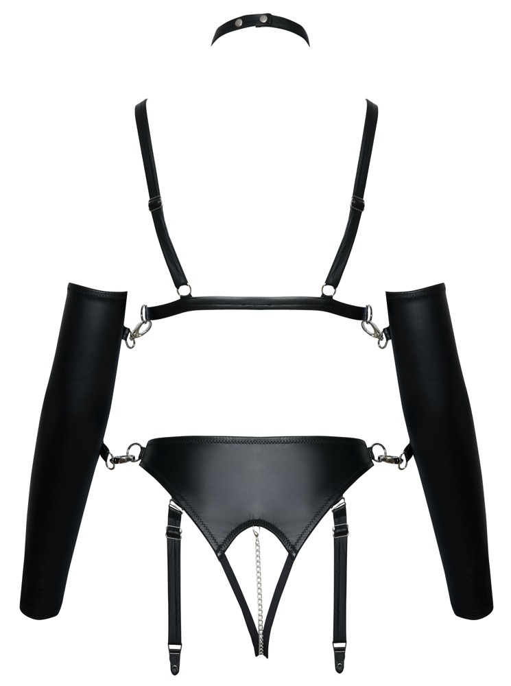 Åpent sett fra Bad Kitty med brystfri BH ab reimer, skrittåpen truse, halsbånd og 2 armmansjetter. Alt i stilig, svart mattlook med sølvfargede detaljer. Det myke, elastiske stoffet føles behagelig mot huden. Justerbare BH-stropper, og truse med justerbare strømpestropper, som også er avtagbare. Lenka i skrittet er også avtagbar. Smalt halsbånd med ring foran og trykknapper bak. Ringer i sida av BH og truse hvor de vedlagte armmansjettene med karabinkrok kan festes under soft bondage.