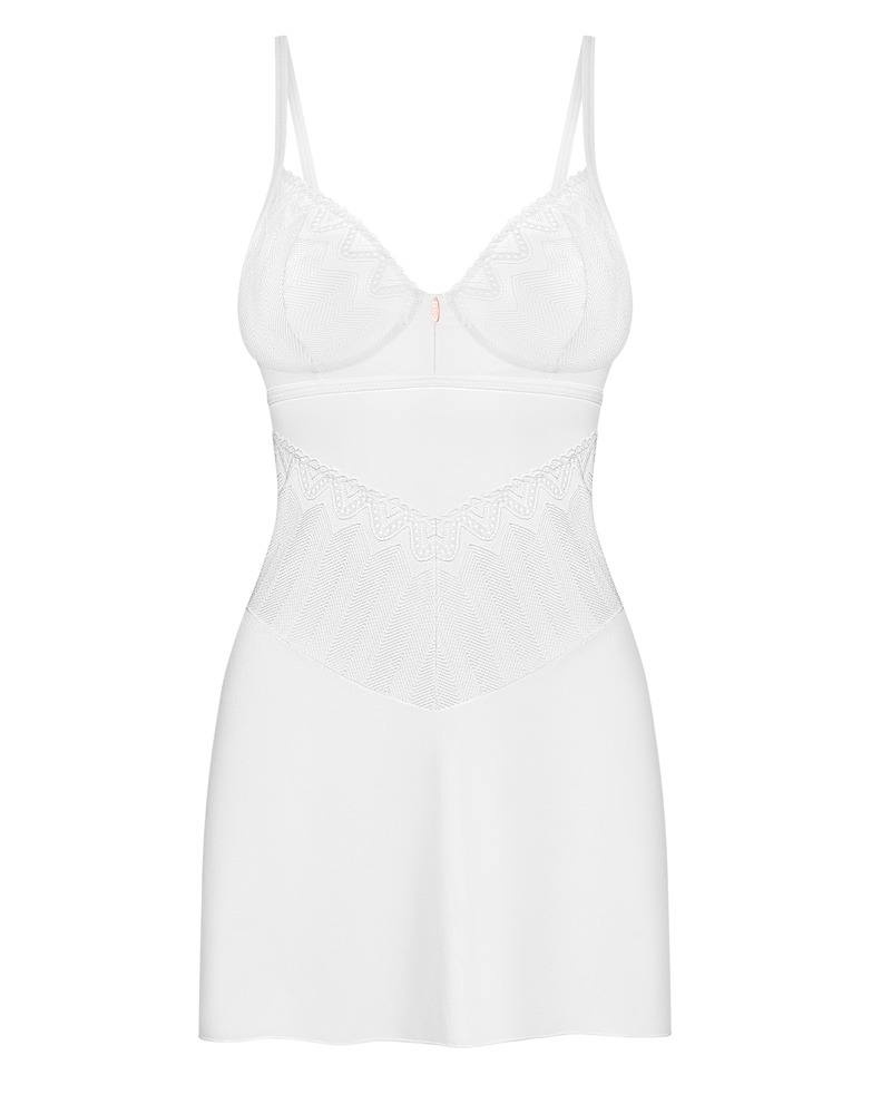 The Alissium set from Obsessive contains a figure-flattering chemise and thong. It is in a delicate lace look and an elegant colour – beautiful and timeless white. It is soft and stretchy. It also has a delicate lace look on the cups and around the waist. There is a discreet decorative detail between the wireless lace cups. The bra straps can be adjusted to fit.
