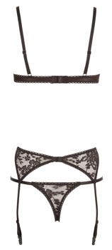 ¡Apasionante! Sujetador abierto con refuerzo push-up, tanga abierta y liguero. El conjunto es de encaje adornado con pequeños lacitos. 90% poliamida, 10% elastán. Sin medias.