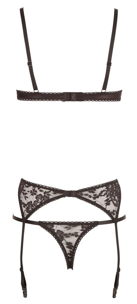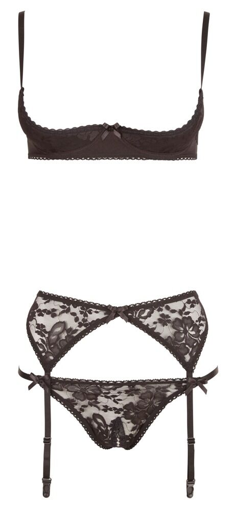 Öppen BH, öppen string och höfthållare i ett set. Alla tre delar av svart, elastisk spets. BH´n har lätt polstrade bygelkupor, riostringen är upphetsande öppen i grenen. 90% polyamid, 10% elastan. Utan strumpor.