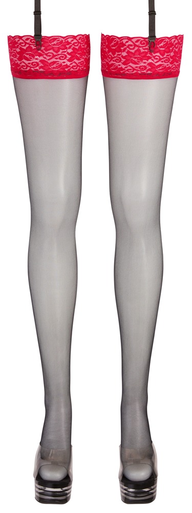 Sensual stockings with red lace around the top. They should be attached to suspender straps. 20 den. Slightly preformed foot part. Oeko-Tex certified.