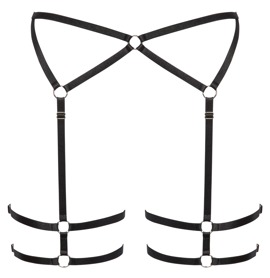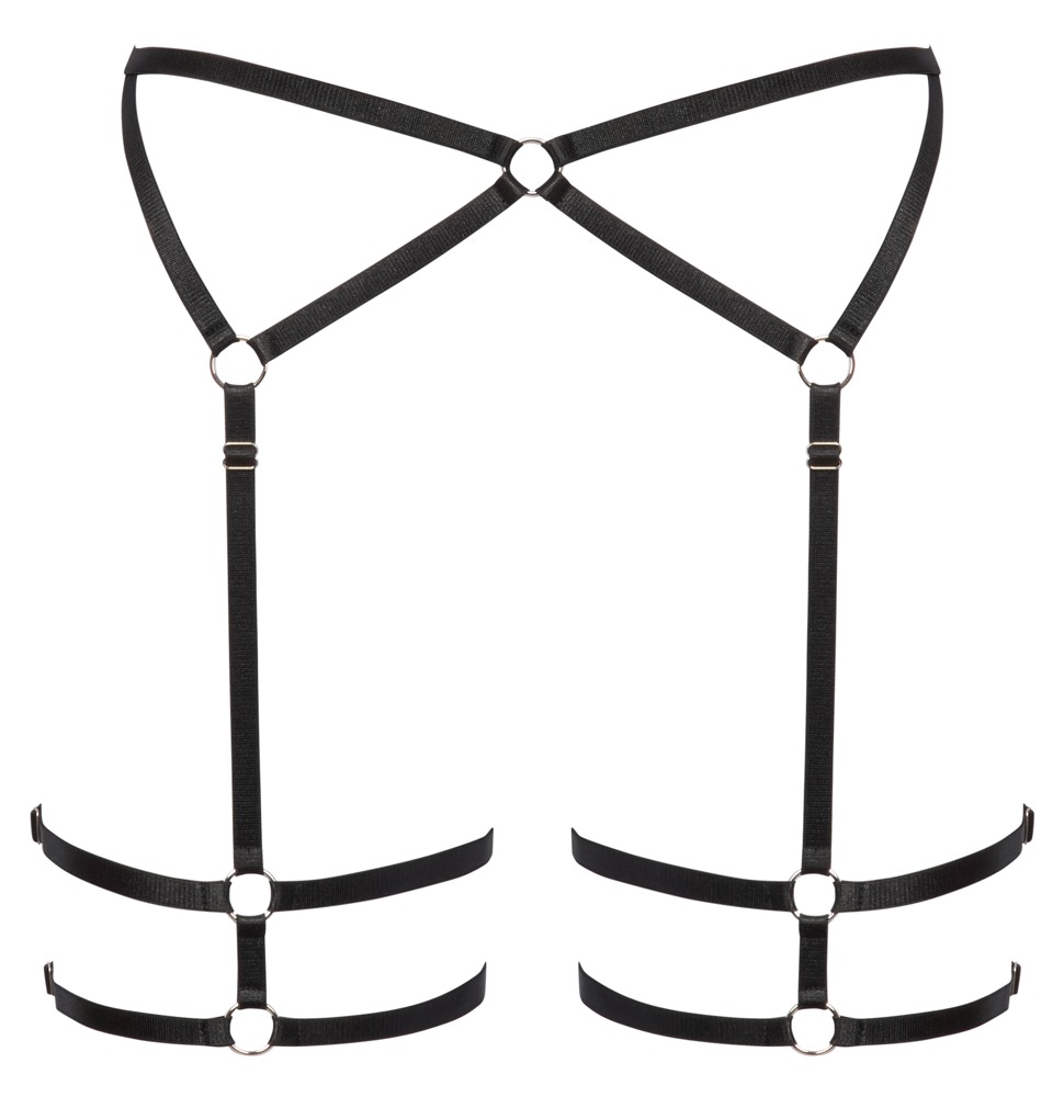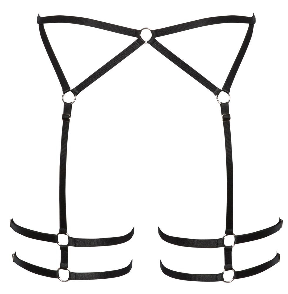 Denna svarta harness från Cottelli LINGERIE presenterar midjan, höfterna och låren på bästa sätt! Mjuka, sidenglänsande stretchremmar och silverfärgade förbindningsringar. Strumphållarna framtil och baktill samt de dubbla lårremmarna kan justeras.