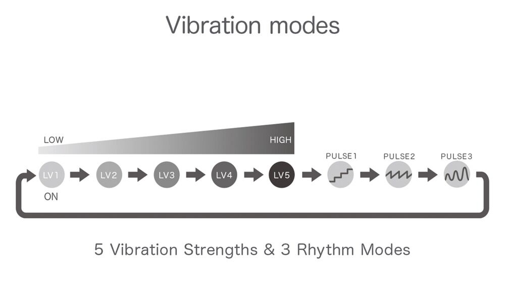 8 leise Vibrationsmodi (5 Intensitäten und 3 pulsierende Rhythmen) lassen keine Langeweile aufkommen. Direkt am Toy sind diese bequem per Knopfdruck steuerbar.