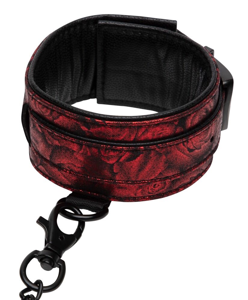 Прочные, высококачественные наручники Sweet Anticipation Ankle Cuffs от Fifty Shades of Grey со съемной соединительной цепочкой с карабином. Удобные манжеты с мягкой подкладкой можно надевать на обе стороны: Одна сторона из черной кожи, другая из атласа с рисунком черной/красной розы. Каждый из них можно отрегулировать по размеру с помощью застежки-пряжки.