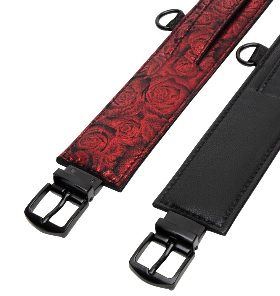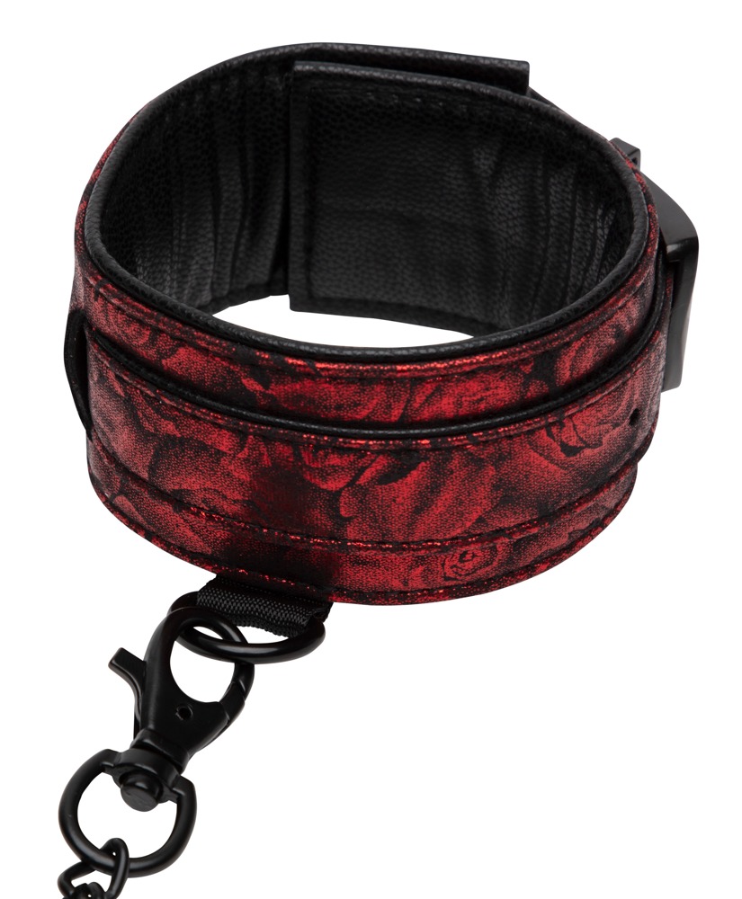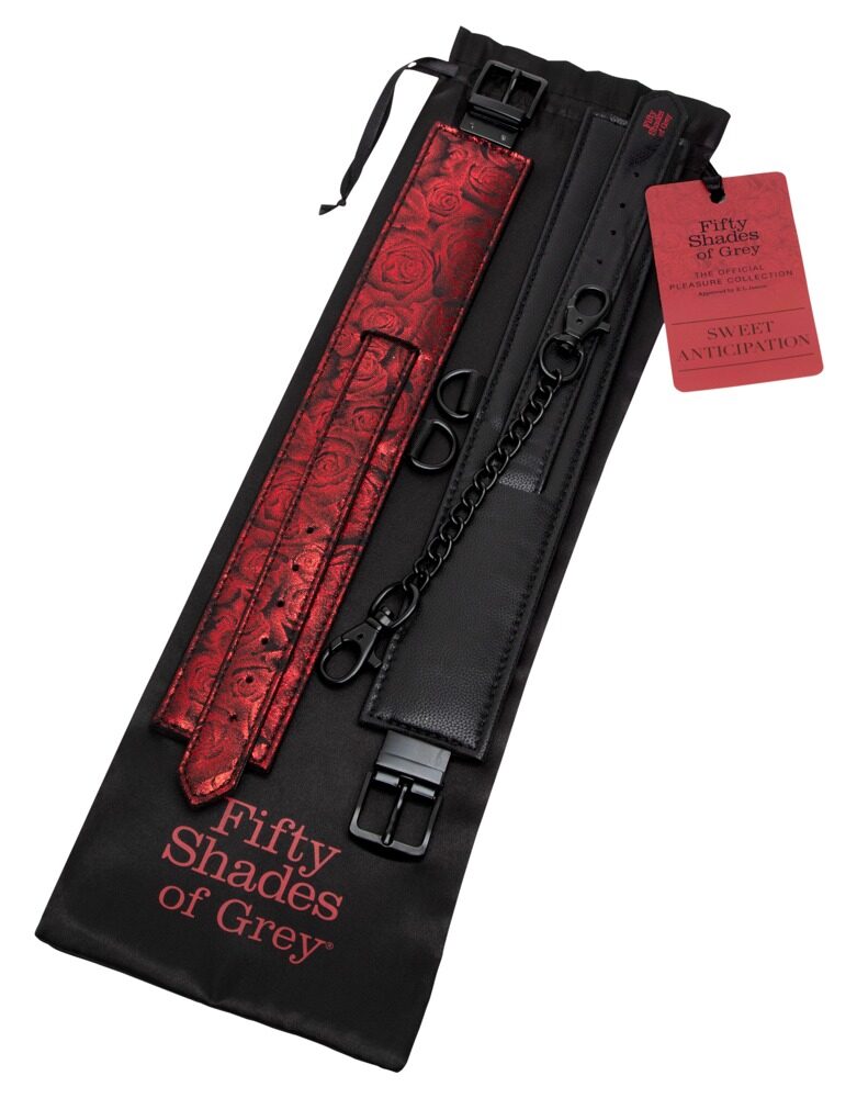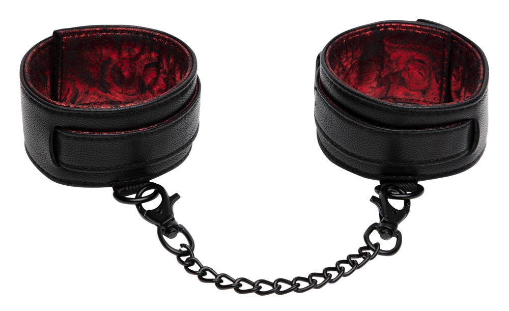 Sturdy, high-quality ankle cuffs Sweet Anticipation Ankle Cuffs from Fifty Shades of Grey with a removable snap hook connection chain. The softly padded restraints can be worn both ways: one side is in a black leather look, the other side is in a black/red satin rose design. Each ankle cuff can be adjusted with the buckle fastener for a perfect fit.