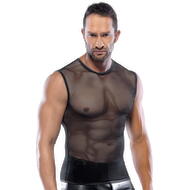 Top från Svenjoyment Bondage i svart, trendig mattlook med nitprydd harness (kan ej tas av). Harnessen har ringar på sidorna där de medföljande remmarna för armarna kan sättas fast. Remmarna i mattlook har justerbara kardborrband.