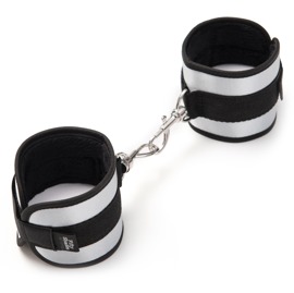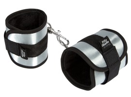Czarne i srebrne kajdanki, które można łączyć karabinkami. Obwód mankietów jest zmienny dzięki zapięciom na rzepy. Materiał: metal, zewnętrzna satyna, wewnątrz miękkie sztuczne futro. Wraz z srebrną torbą do przechowywania.