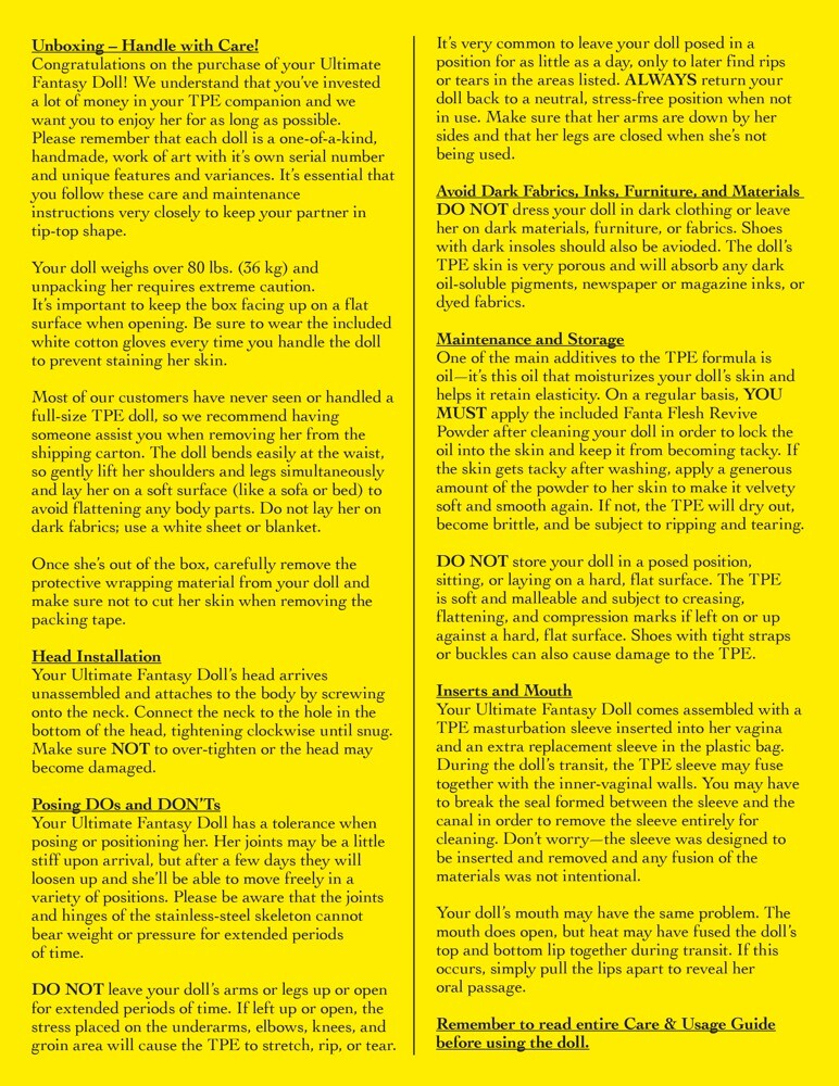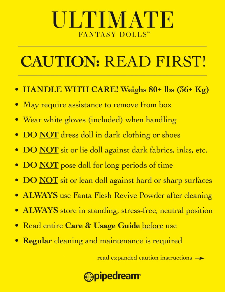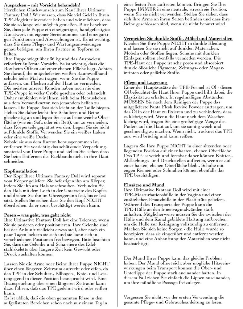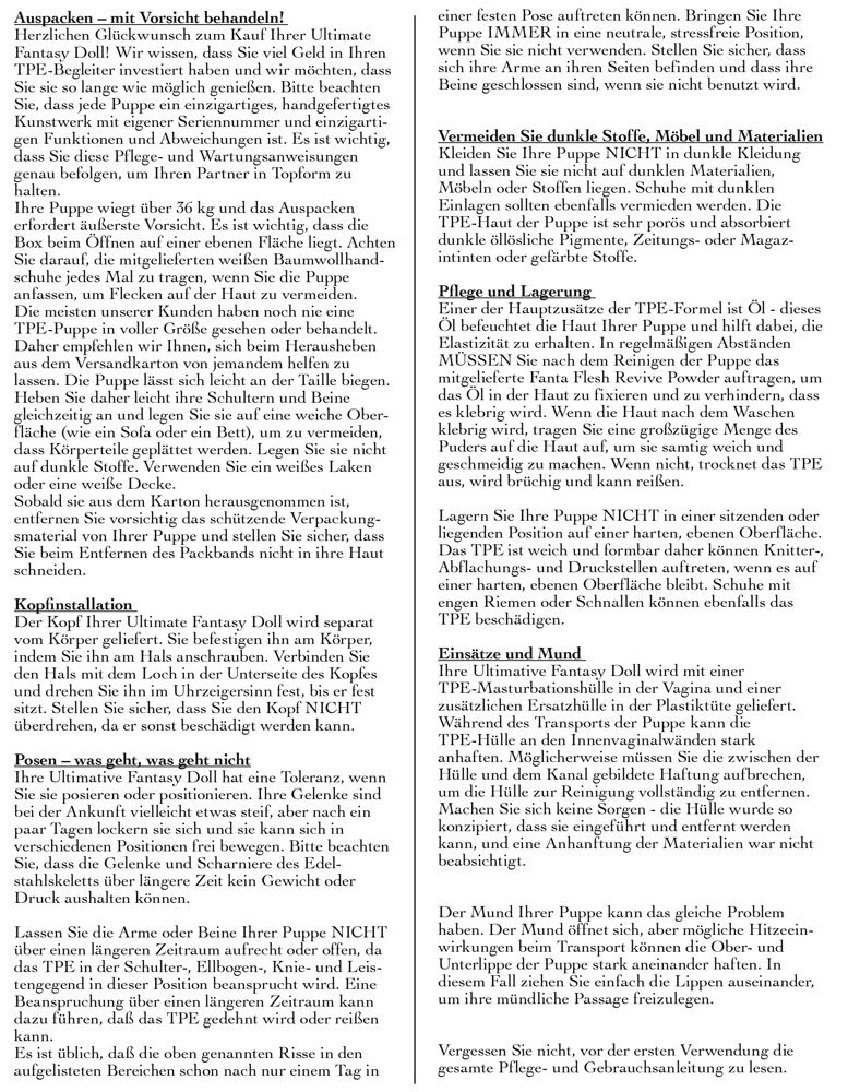 Denne elskovsdukke i livsstørrelse kan næppe skelnes fra en rigtig kvinde! Den langhårede Bianka har et smukt 3D-ansigt med hasselnød brune øjne, øjenvipper og fyldige læber. Hendes hud er lavet af Fanta Flesh materiale i høj kvalitet og føles helt realistisk. Ligeledes er vagina, anus og mundåbning fuldstændig følelsesægte. Skamlæberne virker også forførende ægte. Den rødblonde skønhed har en slank silhuet. Det ekstra store bryst suppleres med perfekt formede brystvorter. Hendes detaljerede hænder og fødder overbeviser helt ned til de velplejede negle. Et aluminiums skelet indeni gør Bianca fleksibel fra hoved til tå. Bolte på fodsålerne lader dukken stå på egne fødder. Herunder omfattende tilbehør: