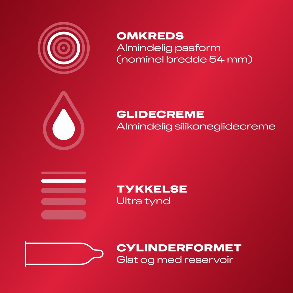 Du glemmer at du bruker kondom når du har på dette flortynne, gjennomsiktige, konturerte kondomet. 20% tynnere material i tuppen lover for lyst med intensive følelser. Med Easy-on passform så det sitter perfekt og er enkelt å rulle på. Sikkerhet med sædbgrop og fuktskikt. Dermatologisk kontrollert og 100% elektronisk testet.