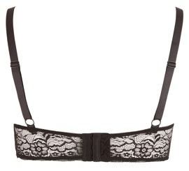 Forførerisk bøyle-BH i svart blonde med ring mellom brystene, lett fôrede skåler og hektelukking bak. Med elastiske bånd for individuell passform. 90% polyamid, 10% elastan.