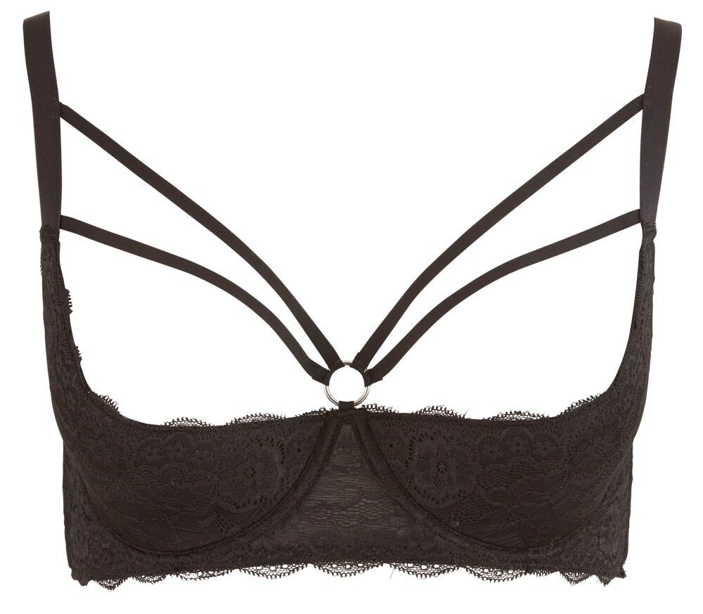 Denna förföriska, öppna bygel-BH av svart spets med ring över bysten, lätt fodrade kupor och hakknäppning baktill presenterar dina bröst väldigt erotiskt. Med elastiska band för en perfekt passform. 90% polyamid, 10% elastan.