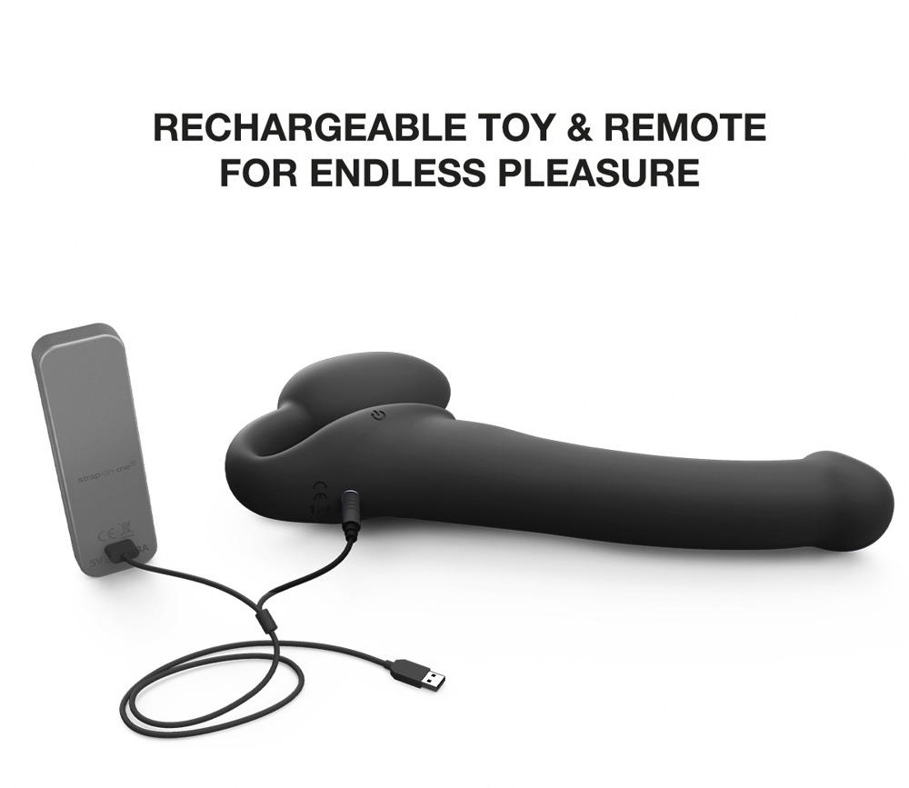 Vibrating Bendable Strap-On fra Strap-on-me forkæler med intense vibrationer gange 3 ved alsidig sololeg eller begge partnere under hed rollespil, pegging og meget mere. 3 kraftige, støjsvage motorer er placeret i den svulmende plug, i hovedet på det markante skaft og i midten for kraftig klitorisstimulering. Motorerne kan styres individuelt ved hjælp af den praktiske fjernbetjening; med et-klik-styringen kan man starte og stoppe med et enkelt tryk på en knap. 3 x 3 vibrationstilstande, hver med 3 intensiteter, giver varieret sjov – selv i badet og under bruseren, da strap-on-vibratoren er vandtæt.