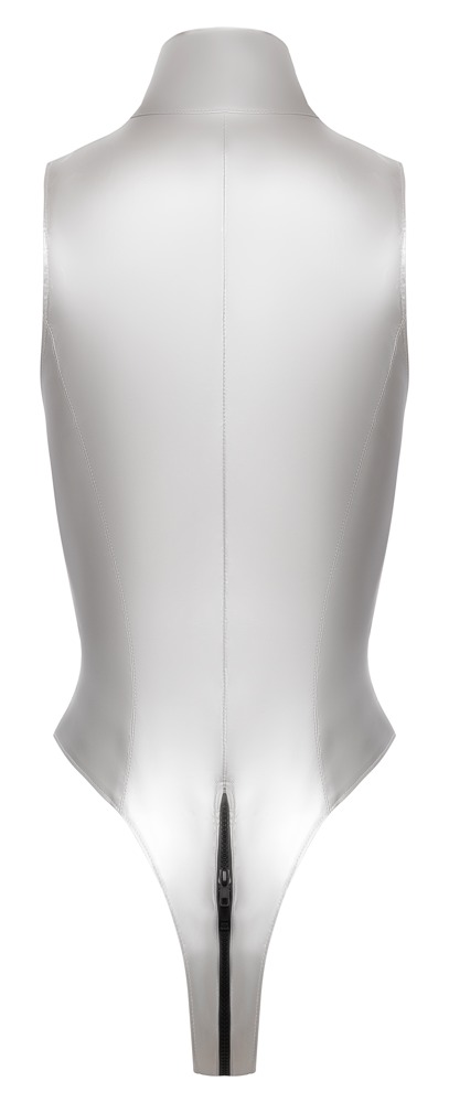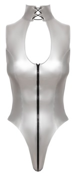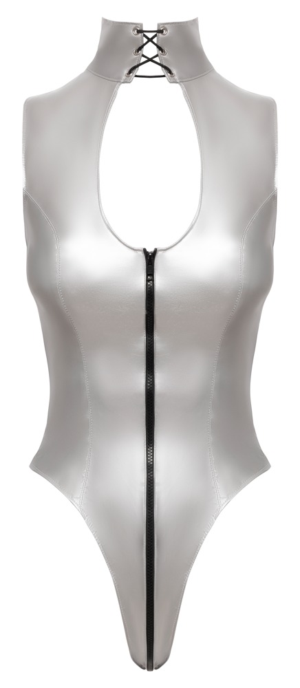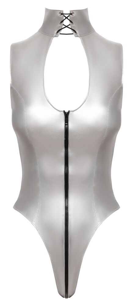 Ärmelloser Body von Black Level komplett im silberfarbenen Lackglanz. In figurnaher Schnittführung mit hohen Beinausschnitten und extravagantem hohem Kragen mit schwarzer Schnürung vorne. Der schwarze 2-Wege-Reißverschluss verläuft vom raffinierten Dekolleté durch den Schritt bis über den Po. Er lässt sich von beiden Seiten öffnen.