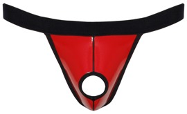 Thong from Svenjoyment with a swell function. Lightly padded in shiny red vinyl with black contrasts. A wide, comfortable, woven elastic waistband.
