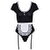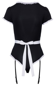 Svart, elastisk, myk body med hvite blondekanter. Kortermet med vid utringing og høy benskjæring. 2 små, hvite pynteknapper foran fullender servitrisestilen. Trykknapper i skrittet og juster- og avtagbare strømpestropper. Det medfølgende hvite forkledet med blondevolang knytes bak.