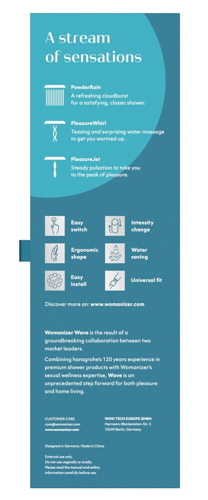 Ergonomically designed, multi-functional shower attachment Wave from Womanizer with patented Pleasure Jet Technology. A completely new shower experience developed in collaboration with Hansgrohe – premium quality Made in Germany! It's not (just) body care and cleansing that's the focus here, but sensually stimulating moments of pleasure in the shower and bath!