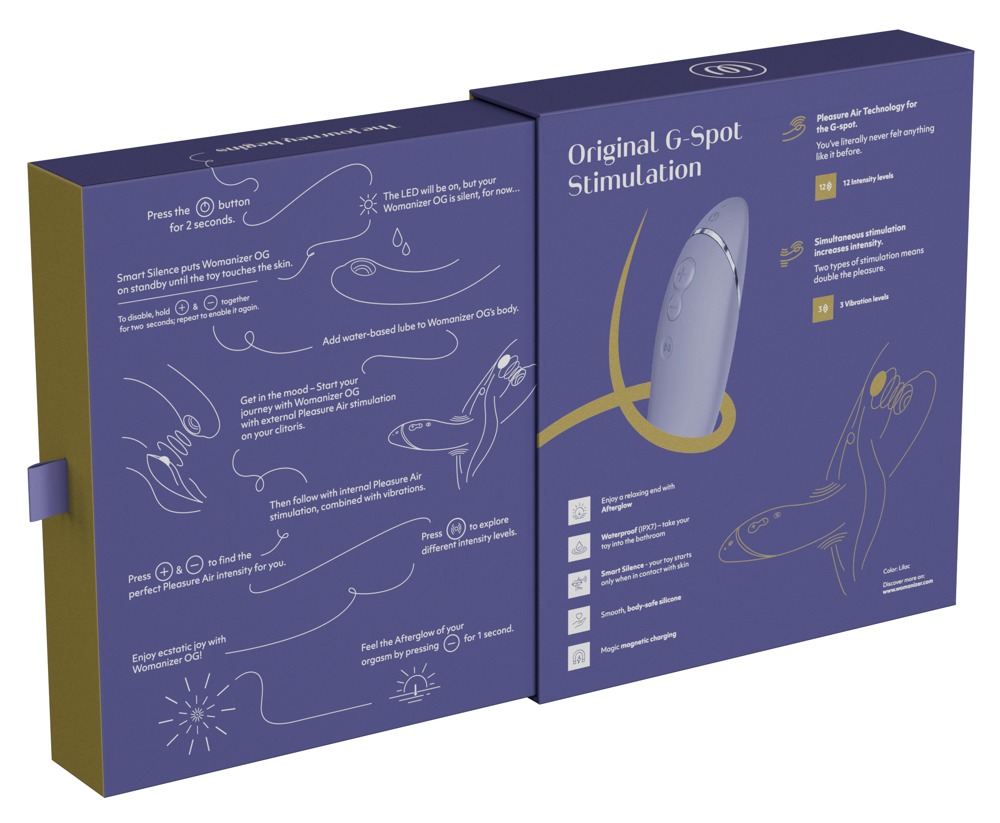 Den patenterade Pleasure Air teknologin stimulerar med pulserande vågor och en skön sugeffekt i 12 intensiteter som bekvämt styrs via knapptryck (+/-). Den samtidiga vibrationen i 3 modus (svag, medel och intensiv) styrs också via knapptryck. Tack vare Smart Silence- funktionen aktiveras Womanizer OG först vid hudkontakt. Tills dess är den i en nästan ljudlös standby-modus. Så att det ska bli ett avslappnat slut på orgasmen, så går Womanizer OG via knapptryck tillbaka till det lägsta steget (Afterglow).