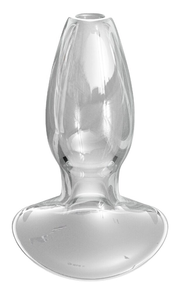 Hohler Analplug mit Stopper, der zu tiefes Eindringen verhindert. Perfekt geeignet für erfrischende Einläufe und Spielchen mit einem Minivibrator. Exklusives, transparentes Design aus Borosilikatglas. Füllbar bis 29,5 ml.