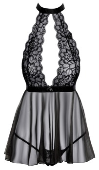 Kort, utsvingt babydoll fra kissable i svart gjennomsiktig blonde (overdel) og powernet (skjørtdel). Smidig myk og elastisk stoff som føles behagelig mot huden. Dyp cutout-formet utringing og ryggfri. Satenghalsbåndet lukkes med sløyfe i nakken og satengknyting i livet bak. Matchende strengtruse inklusive.