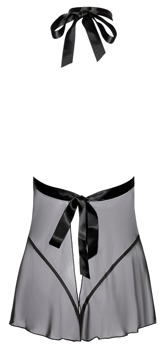 Krótki flared babydoll by kissable w czarnej przejrzystości wykonany z pięknej koronki (góra) i delikatnego powernetu (spódnica). Jedwabiście miękkie i elastyczne dla wysokiego komfortu noszenia. Z przodu z obfitym dekoltem w dół do talii, bez pleców. Satynowa opaska wiązana na szyi, satynowy pasek w talii z tyłu. W zestawie znajdują się pasujące małe stringi.