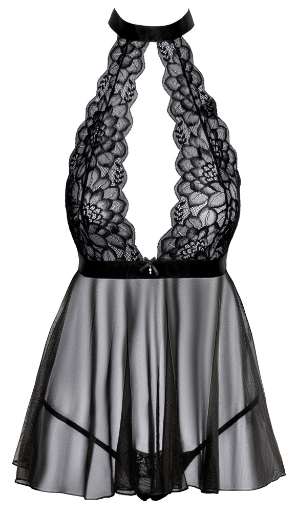 Babydoll court et évasé de kissable en transparence noire en dentelle magnifique (top) et en powernet fin (jupe). Doux comme de la soie et élastique pour un grand confort. Devant avec un décolleté généreux jusqu'à la taille, dos nu. Le tour de cou en satin se noue dans la nuque, le tour de taille en satin dans le dos. Le petit string assorti est inclus.