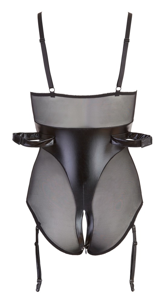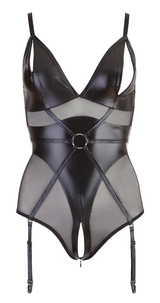 Svart bondagebody med ring i mitten, små dragkedjor på kuporna samt en 2-vägsdragkedja genom grenen till rumpan. Baktill med 2 öglor där partnern kan sätta fast dina armar. Axelbanden är justerbara, strumphållarna justerbara och avtagbara.