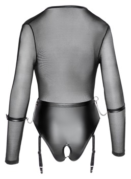 Ekstra dypt utringet body fra Cottelli BONDAGE med strømpestropper. Overdel og lange ermer er i gjennomsiktig powernet og den skrittåpne trusedelen i trendy mattlook. Det perfekte antrekket når du er klar for spontane sexeventyr! Det festsydde beltet har 2 ringer foran og en ring i hver side hvor de vedlagte håndlenkene med borrelås kan festes med karabinkrok. De justerbare strømpestroppene er avtagbare.