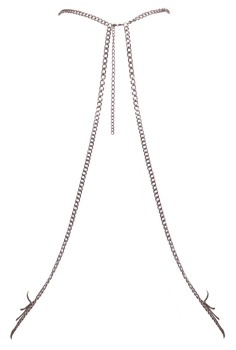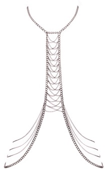 Sølvfarvet kropskæde fra Cottelli ACCESSOIRES med overdådig kædebesætning mellem brysterne og kædebesætning over hofterne. Kan justeres og tilpasses individuelt i nakken med karabinhager. Uanset om den bæres alene som lingeri for et erotisk look eller kombineres stilfuldt med badetøj og tætsiddende outfits – denne glamourøse kropssmykke er altid et blikfang!