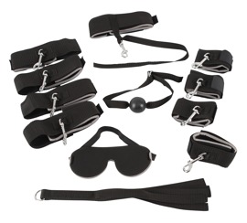 Płyta wiązania z 2 płytami 60 x 60 cm (rozłożonymi na 120 cm), w tym 4 wyściełane mankiety na ramiona (długość 39 cm, szerokość 6 cm), 4 wyściełane mankiety na nogi (długość 56 cm, szerokość 6 cm), 1 mankiet na szyję (wysokość 5,5 cm) i 1 knebel na usta (Ø 4,1 cm) z regulowanym paskiem. Bicz przekonuje długością 38 cm. Maska oczna jest wyposażona w rozciągliwy pasek.
