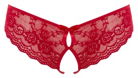 Ce joli slip combine une noble dentelle de fleurs avec des découpes ornées de nœuds sur le devant et le dos. L'entrejambe n'est maintenu que par deux élastiques et donne des aperçus très érotiques. Grâce à son pourcentage élevé d'élasthanne, le slip est agréablement confortable et s'adapte parfaitement aux courbes féminines.