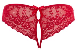 Disse søde trusser kombinerer elegante blomsterblonder med udskæringer dekoreret med sløjfer foran og bagpå. Skridtet holdes kun af 2 elastiske bånd som sikrer høj-erotiske indblik! Takket være den høje elastan-andel er trussen behageligt og tilpasser sig perfekt til de feminine kurver.
