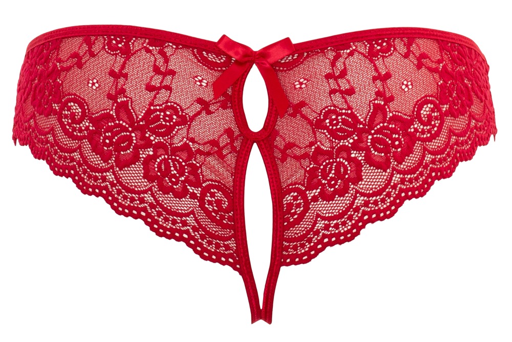 Dieser süße Slip kombiniert edle Blütenspitze mit schleifenverzierten Cut-Outs auf der Vorder- und Rückseite. Der Schritt wird lediglich durch 2 elastische Bänder gehalten und gewährt hocherotische Einblicke. Durch seinen hohen Elasthan-Anteil ist der Slip angenehm bequem und passt sich perfekt den weiblichen Rundungen an.