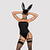 Kostymesett Bunny fra Obsessive i svart. Settet består av body, hudemaske i lakk med ører, halsbånd og et par strømpestropper og nettingstrømper. Elastisk, myk body i stroppeløs tubeform. Halv hodemaske med øyeåpninger og knyting bak. Satenghalsbånd med knyting. Avtagbare strømpeholdere med lårreim og sløyfe.