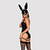 Ensemble de déguisement Bunny de Obsessive en noir. Composé d'un body, d'un masque de tête laqué avec oreilles, d'un collier et d'une paire de jarretelles à clip et de bas résille. Body élastique et doux, style tube sans bretelles. Demi-masque de tête avec ouvertures pour les yeux, à nouer à l'arrière. Collier en satin à nouer. Les porte-jarretelles à clip amovibles sont munis de jarretelles et de nœuds.