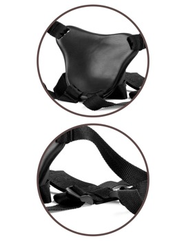 The easy strap-on system is based on the anatomically curved body plate with a suction dock where a dildo's/vibrator's suction cup (not included) gets stuck securely to it. The suction dock keeps the dildo/vibrator in perfect thrusting position (Push & Play). The body plate distributes pressure evenly across the pelvic region therefore reducing pin-point pressure. This comfy version means that the body plate is even more comfortable because it is softly padded. The wide, sturdy straps can be adjusted with the plastic clasps for a secure but comfortable fit.