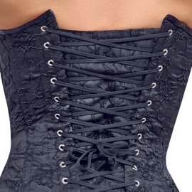 The strapless, full cup corsage from Cottelli PARTY is made out of velvety black matte material. The integrated shaping wires (6 per side) create a beautiful silhouette and they also emphasise the curves as well. There is a hook and eye fastener at the front, which means that it is quick and easy to put on and take off. There is full-length lacing at the back with a piece of material underneath it so that no skin can be seen.