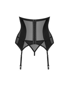 The simple underbust corsage with Chic Amoria thong by Obsessive is a semi-transparent eye-catcher with black inserts. The suspender straps are detachable, allowing for versatile wearing options. It can be individually adjusted at the back with a hook fastener.
