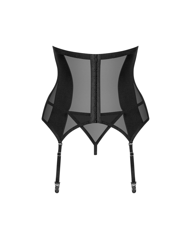 Underbyst-corsagen Chic Amoria från Obsessive är ett halvgenomskinligt plagg med svarta insatser. Strumphållarna är avtagbara och möjliggör många varianter hur den kan bäras. Baktill individuellt anpassningsbar med en hakknäppning. Inklusive string.