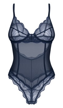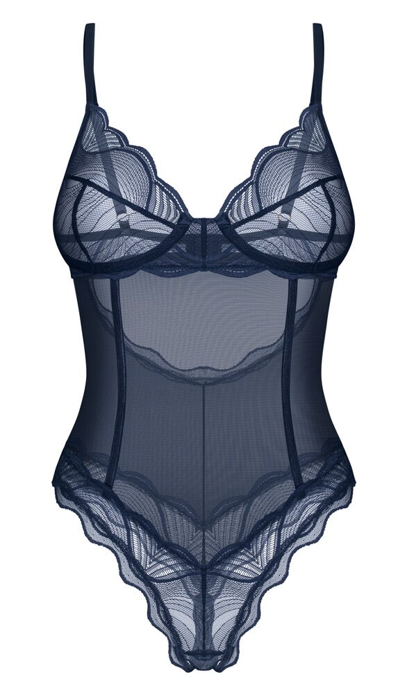 The transparent crotchless body, Nightly Blue from Obsessive, is in an elegant blue-in-blue colour. It is soft and stretchy with a delicate lace look. It also has wireless cups for a beautiful cleavage area. The straps and the hook fastener over the uncovered back can be adjusted to fit.