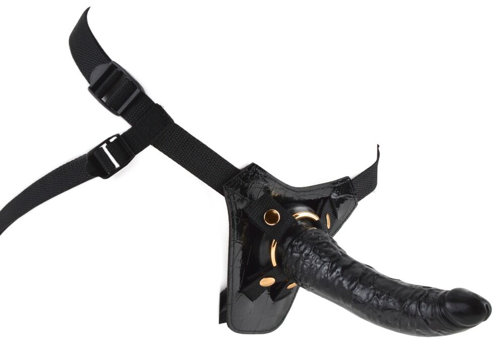 Strap-on som er justerbart i størrelse, med uttagbar dildo. Dildoen er i naturstil og har sugefot, som muliggjør hemningsløse ritt handsfree. Strap-onet er i edel slangeskinn stil med gullfargede detaljer.