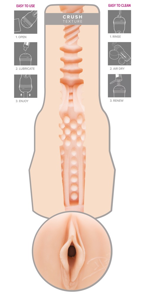 Masturbador con abertura para la vagina. Impresión original de la zona íntima de la estrella erótica Dillon Harper. Canal de placer Crush con protuberancias, estrías y ranuras de diferentes tamaños para una superficie estimulante. Tapa de la funda. Firma de la estrella junto a los labios vaginales. Textura superskin.