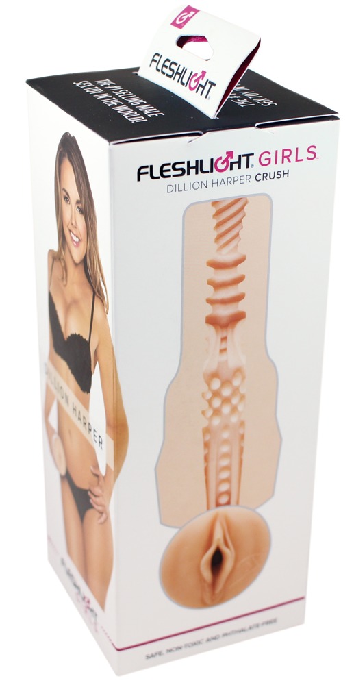 Hudfärgad masturbator med vaginaöppning. Originalavtryck av erotikstjärnan Dillon Harper Crush intimzon. Lustkanalen har olika stora noppor, lameller och räfflor för bästa stimulation. Med lock och stjärnans autograf bredvid blygdläpparna. SuperSkin Textur. Total längd: 25 cm. TPE.
