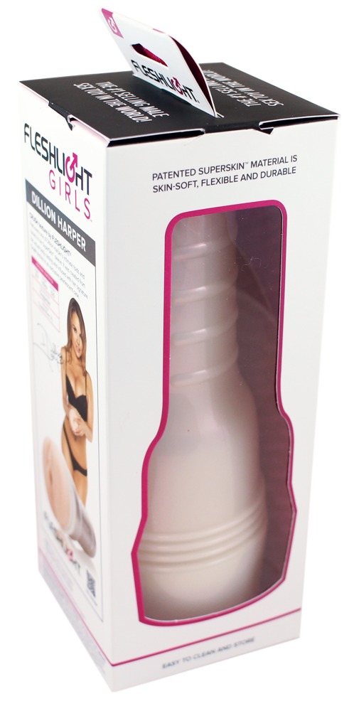 Hudfarvet masturbator i perlemorsfarvet dåse med livagtig efterlignet vaginaåbning og autograf af pornostjernen Dillon Harper samt noppet og rillet glædeskanal. Aftageligt til rengøring.