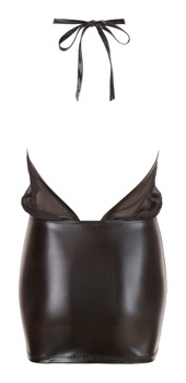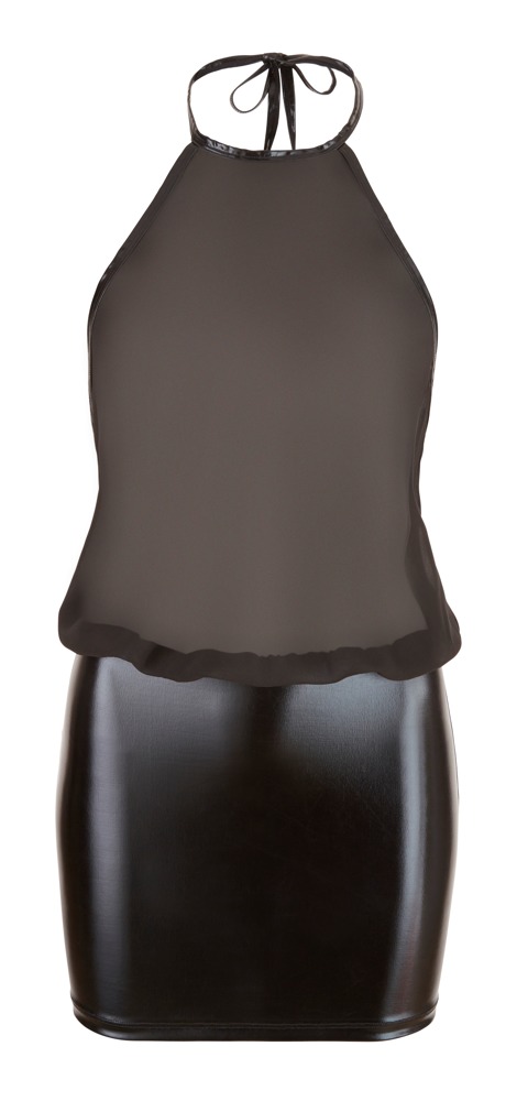 Denne sorte minikjole med neckholder til at binde er højskudt foran, og om bag dejlig åbent. Nederdelens er lavet af stram og skinnende wetlook, mens den gennemsigtige chiffontop er lidt bredere. Hvilken dejlig kontrast!