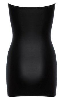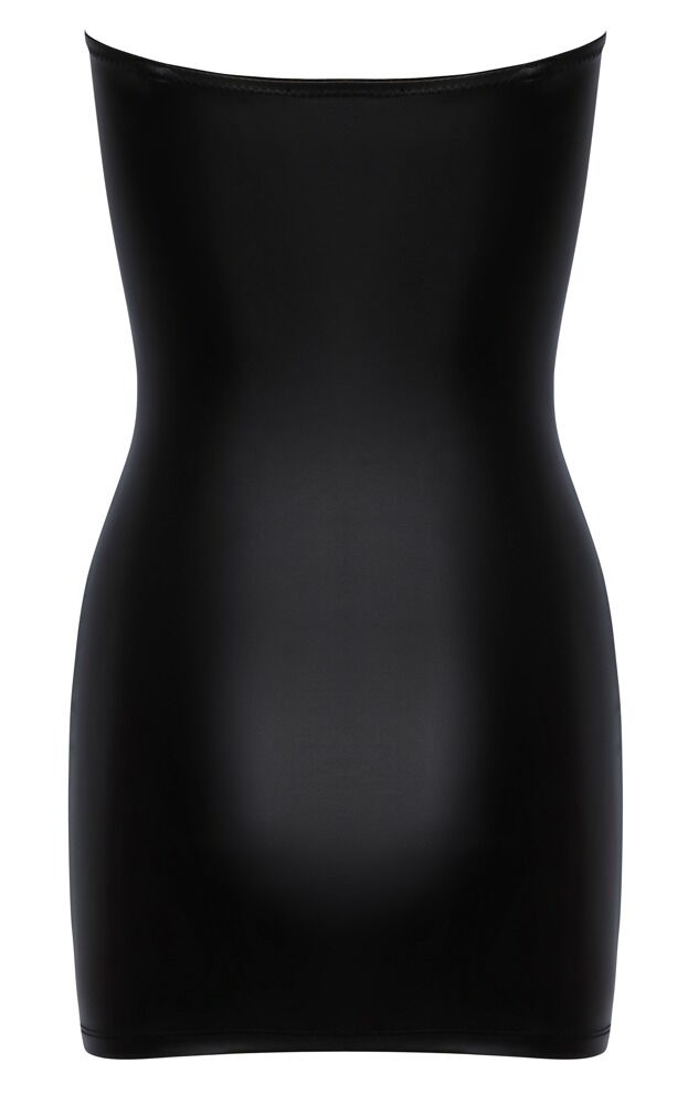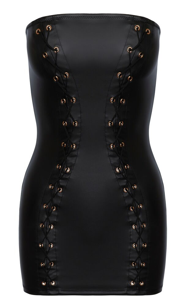 This short, strapless tube dress has an elegant black matte look. With a narrow cut and fitted with rose gold-coloured metal eyelets for the 2 decorative laces at the front in a womanly hourglass look. Soft and highly stretchy for high comfort.