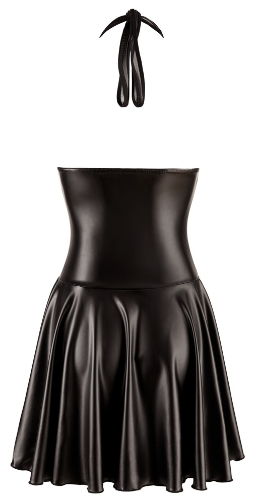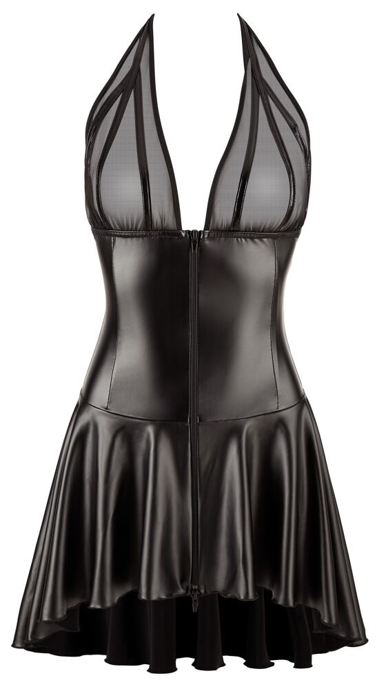 The short dress from NOIR is tight-fitting and tapered with a flared skirt part. It is made out of soft powernet with vinyl details (top part) and power wet look (skirt part). There is a full-length 2-way zip at the front – from the cleavage area right down to the hem. Backless – the halterneck can be tied together. The flared skirt is slightly shorter at the front than the back.