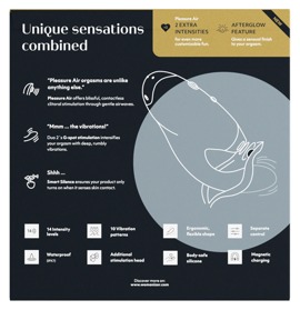 DUO 2 jest jeszcze mocniejszy i oferuje 12 poziomów intensywności stymulacji łechtaczki. Dla punktu G dostępnych jest 14 poziomów intensywności i dodatkowe 10 trybów wibracji do wyboru. Obie funkcje, wibrator i technologia Pleasure Air™, mogą być sterowane niezależnie od siebie.