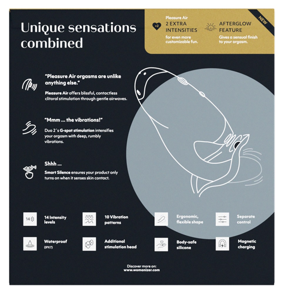 Den revolutionära Womanizer Pleasure Air™ Technology kombinerat med kraftfull G-punkt-stimulation - det är DUO 2 från Womanizer. Den klassiska Womanizer klitorispåsatsen stimulerar den kvinnliga lustpärlan, medan den vibrerande armen, som anpassar sig flexibelt till den kvinnliga kroppsformen, stimulerar den inre lustpunkten perfekt.