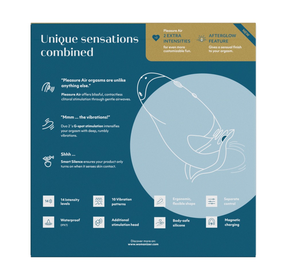 Den revolutionära Womanizer Pleasure Air™ Technology kombinerat med kraftfull G-punkt-stimulation - det är DUO 2 från Womanizer. Den klassiska Womanizer klitorispåsatsen stimulerar den kvinnliga lustpärlan, medan den vibrerande armen, som anpassar sig flexibelt till den kvinnliga kroppsformen, stimulerar den inre lustpunkten perfekt.